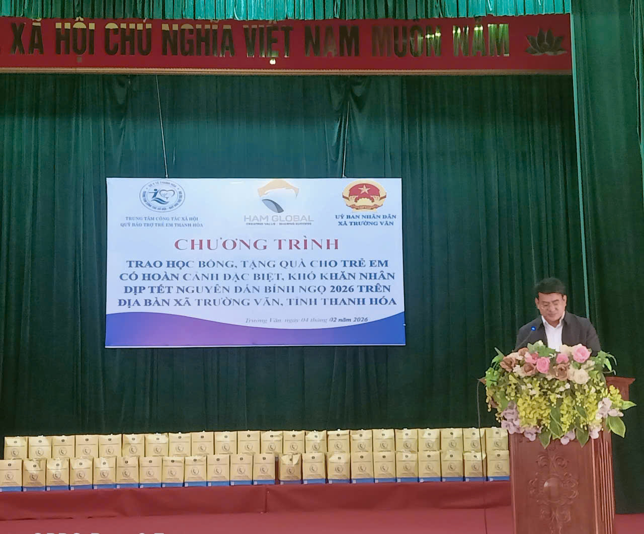 Nhân dịp Tết Nguyên đán Bính Ngọ 2026, Chiều ngày 04/02/2026, UBND xã Trường Văn đã phối hợp với Quỹ Bảo trợ trẻ em Thanh Hóa và Công ty Ham Global tổ chức chương trình trao học bổng, tặng quà cho trẻ em có hoàn cảnh đặc biệt khó khăn trên địa bàn xã. Chương trình là hoạt động có ý nghĩa thiết thực, thể hiện sự quan tâm sâu sắc của các cấp ủy Đảng, chính quyền địa phương, các tổ chức xã hội và doanh nghiệp đối với công tác chăm sóc, bảo vệ và giáo dục trẻ em.